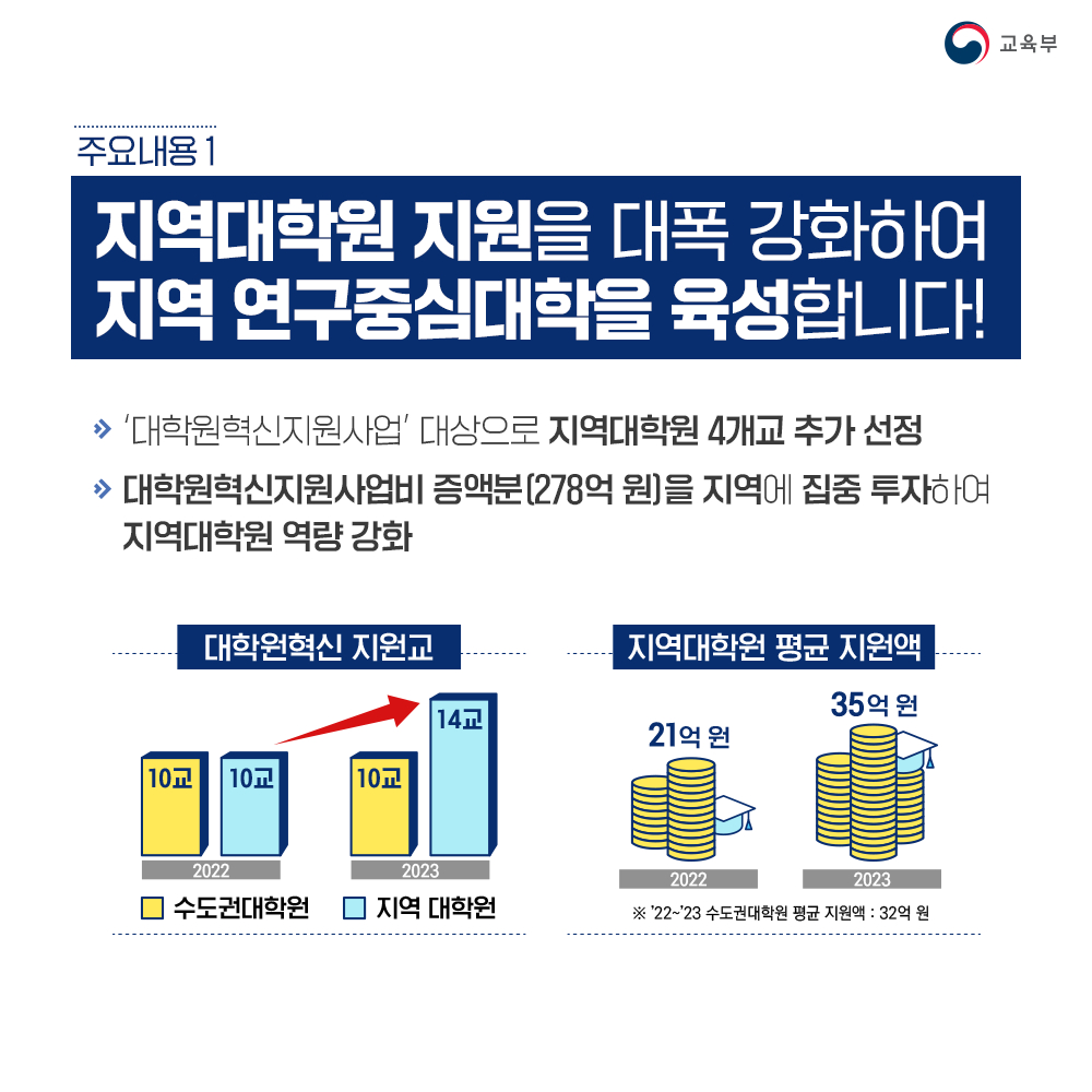 ✔ 지역대학원 지원을 대폭 강화하여 지역 연구중심대학을 육성합니다!
