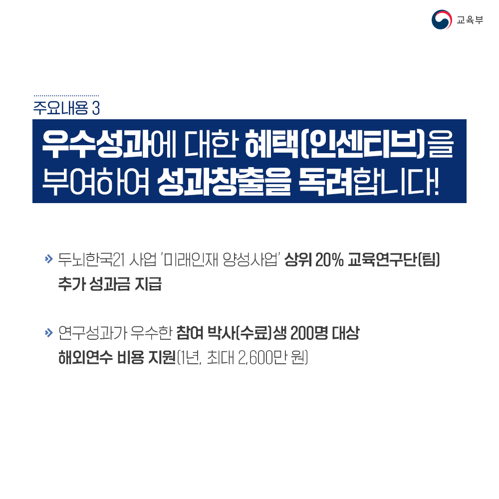 두뇌한국21 사업 '미래인재 양성사업' 상위 20% 교육연구단(팀) 추가 성과금 지급