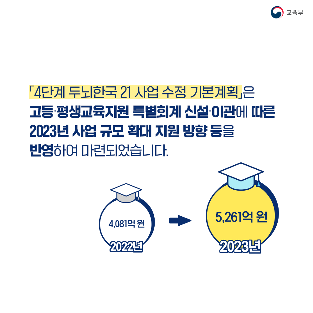 「4단계 두뇌한국 21 사업수정 기본계획」은 고등·평생교육지원 특별회계 신설·이관에 따른 2023년 사업규모 확대 지원 방향 등을 반영하여 마련 되었습니다.