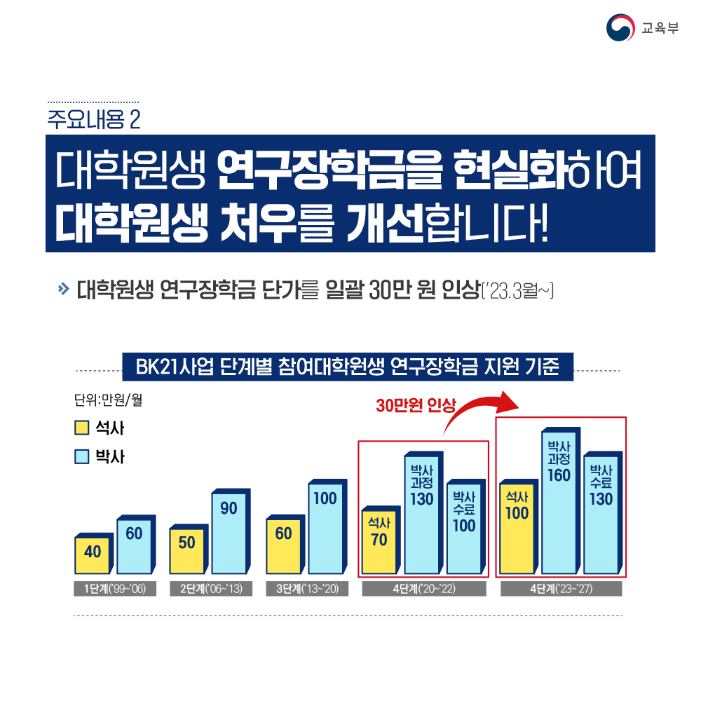 대학생 연구장학금 단가를 일괄 30만 원 인상(`23.3월~)