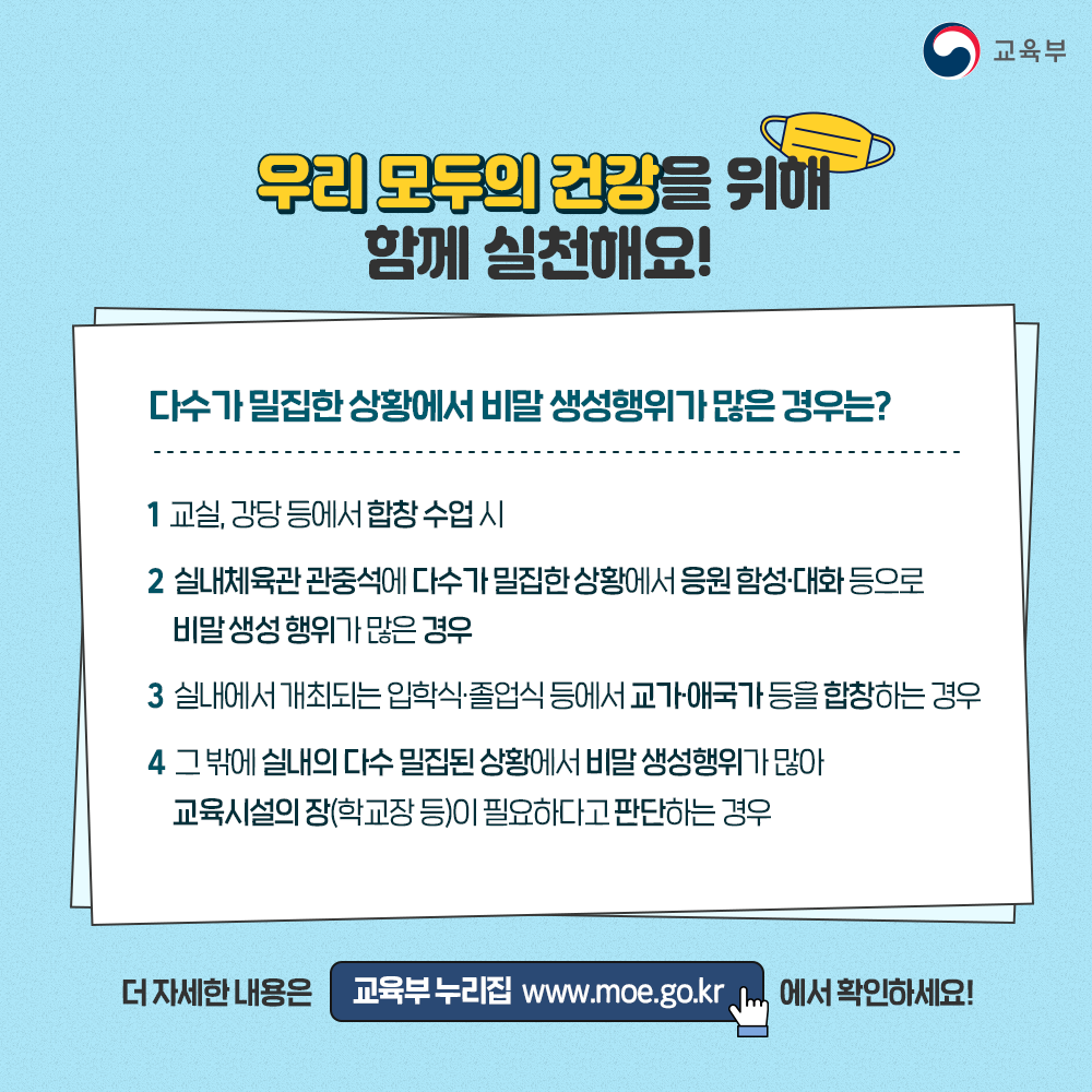- 그 밖에 실내의 다수 밀집된 상항에서 비말 생성행위가 많아 교육시설의 장(학교장 등)이 필요하다고 판단하는 경우