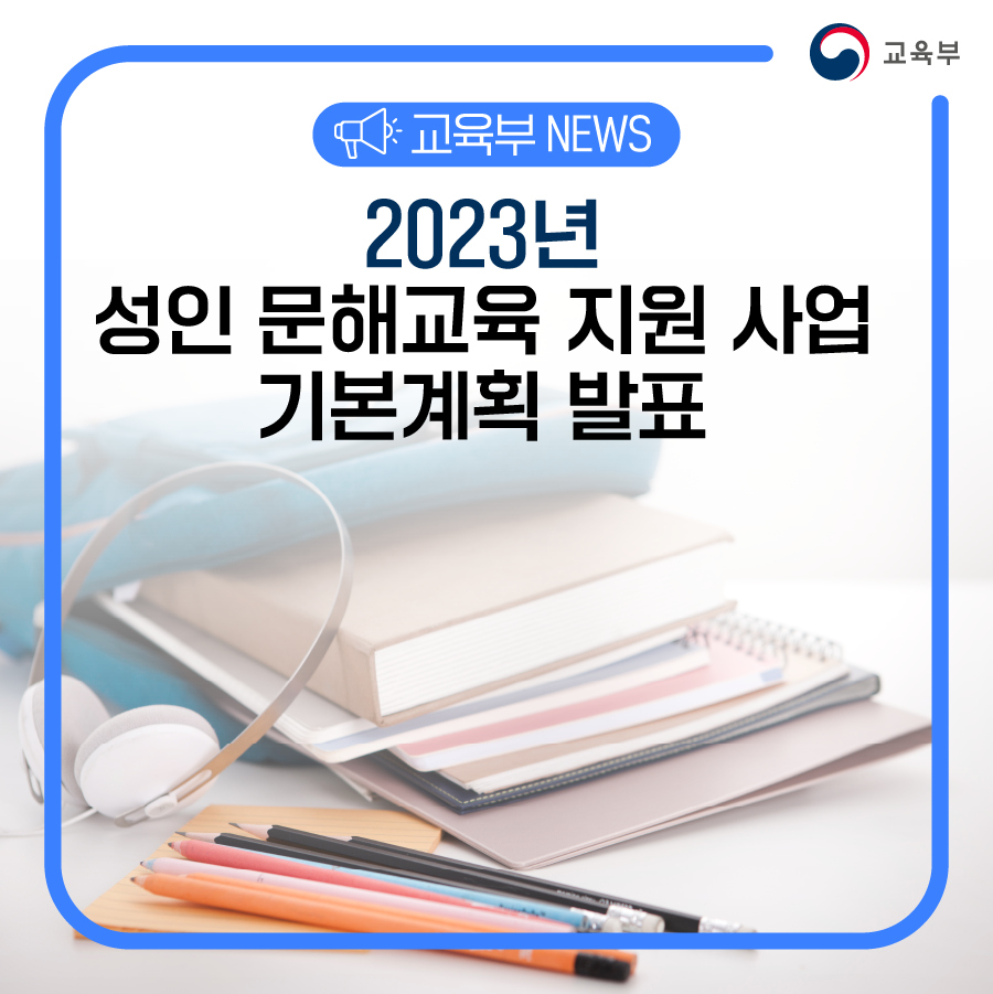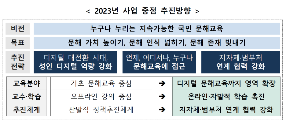 교육부(부총리 겸 교육부장관 이주호)는 사회·경제적 여건으로 교육기회를 놓친 비문해·저학력 성인에게 문해교육의 기회를 확대하기 위한 「2023년 성인 문해교육 지원 사업 기본계획」을 발표한다. 이번 계획은 ①디지털 문해교육 신규 지원 추진, ②온라인·자발적 학습 촉진, ③지자체·범부처 연계 협력 강화를 중점으로 추진한다.