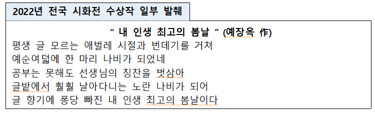 특히, 전국 단위 시화전 연계 개최를 통해 늦은 나이에 한글을 공부하고 깨우친 학습자의 노력과 성과를 홍보할 예정이다.