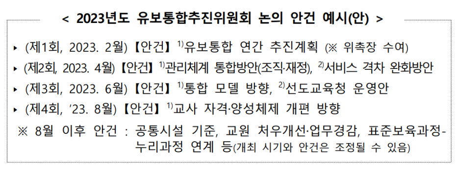 | 2023년부터 유치원·어린이집 간 격차 해소 과제 우선 추진 2023년에 관리체계 통합을 위한 법률 일괄 제·개정 추진 → 2025년부터 교육부와 시도교육청으로 통합 통합기관 모델은 유보통합추진위원회에서 충분히 논의 후 제시  |