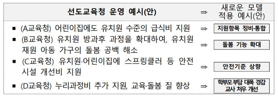 아울러, 2013년부터 동결되었던 돌봄지원비(유치원방과후과정비, 어린이집누리운영비)를 2024년부터 현실화하여 유치원의 돌봄 기능 확대를 유도하고 어린이집의 취약 돌봄 기능(야간연장, 휴일보육 등)도 지속 강화한다. 유보통합추진단은 2023년 하반기 중「서비스 격차 완화방안」을 수립하고, 「지방교육재정교부금법시행령」을 개정하여, 시도교육청의 예산을 추가 지원할 수 있도록 적극적으로 입법 지원한다.