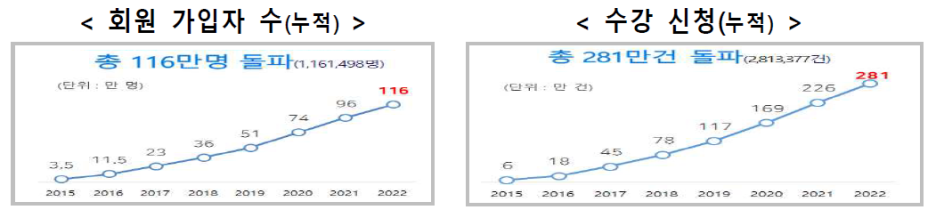 케이무크(K-MOOC)는 대학 수준의 강의를 온라인으로 무료 제공하여 국민의 지식 공유에 기여한다는 목적에서 2015년에 서비스를 시작하였으며, 그 규모가 지속적으로 확대되어 2023년 1월 현재 1,879개의 강좌를 제공하고 있다. 그간 콘텐츠 확대와 함께 케이무크 이용자 수도 지속해서 증가하여, 2023년 1월 현재 케이무크 회원 가입자 수는 116만 명, 수강 신청자 수는 281만 명을 돌파하였고, 국외 방문자 건수도 33만 건에 이른다.