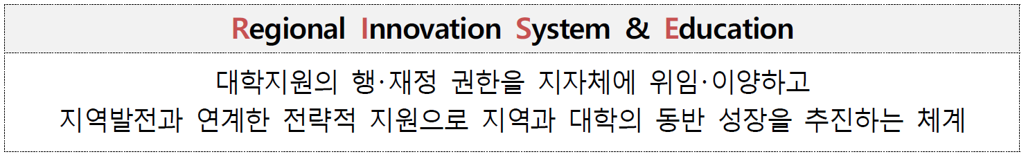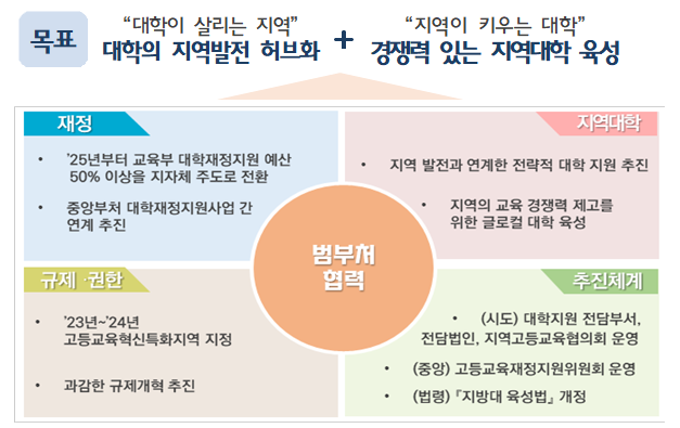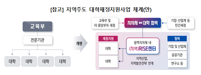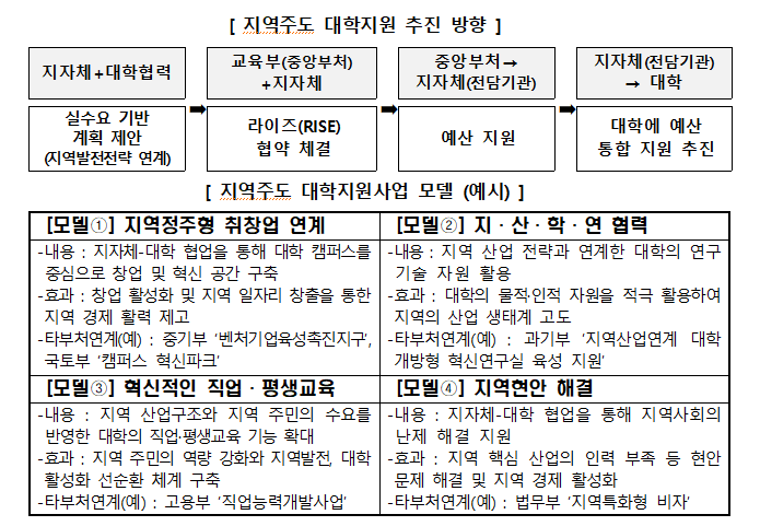 정부는 ‘지역 대학에 대한 지자체의 책무성 강화’를 국정과제로 설정하고, 지역산업에 맞는 ‘지역인재 양성-취업-정주’ 체계 구축, 지역대학 중심 창업·산학 협력 강화, 지역 정주형 우수 유학생 유치에 힘쓰고 있다. 이에, 교육부는 지자체가 주도로 지역발전과 연계하여 선택과 집중을 통해 지역대학에 투자할 수 있도록 지자체의 대학지원의 권한을 확대하고, 혁신을 위해 노력하는 대학에 대한 규제를 대폭 완화하는 라이즈(RISE)체계를 구축한다.