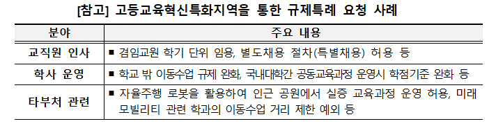 시범지역을 고등교육혁신특화지역(「지방대육성법」제22조)으로 지정하고, 대학과 지역의 혁신에 필요한 규제 특례는 신속히 적용될 수 있도록 지원한다.