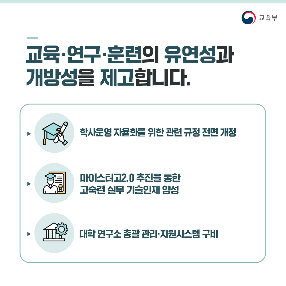 교육·연구·훈련의 유연성과 개방성을 제고합니다.