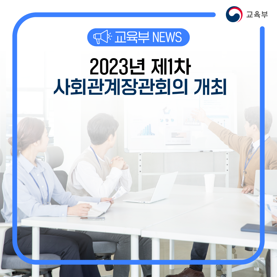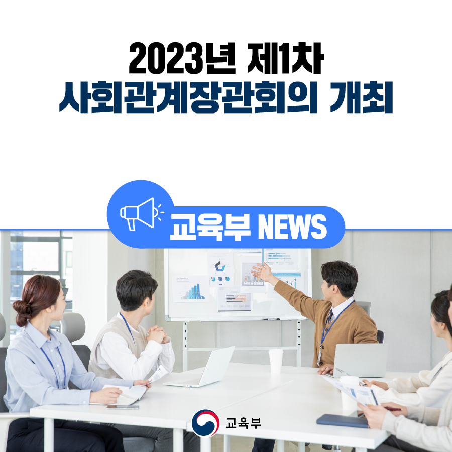 교육부(부총리 겸 교육부장관 이주호)는 2월 6일(월) 정부서울청사에서 제1차 사회관계장관회의를 개최한다. 이번 사회관계장관회의 심의 안건은 ①2023년 핵심 사회정책 추진계획, ②제2차 한국수어 발전 기본계획(2023~2027), ③제4차 지하역사 공기질 개선 대책(2023~2027)으로, 주요 내용은 다음과 같다.