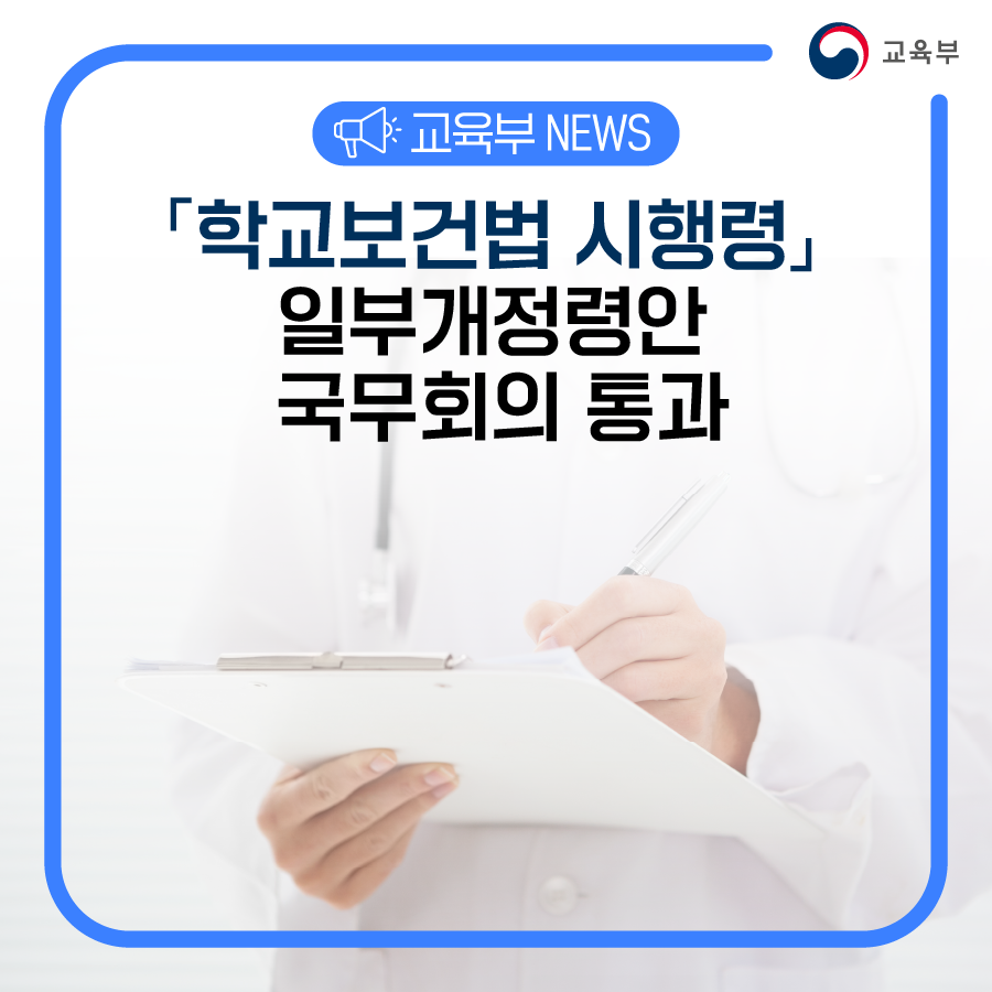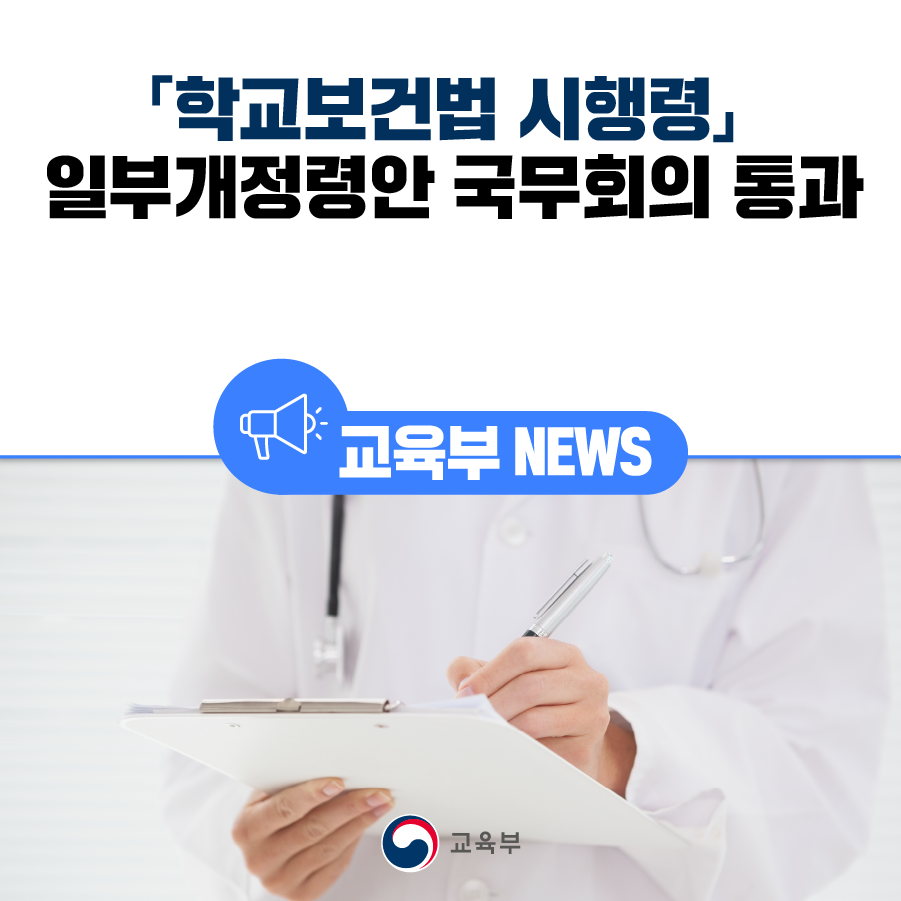 교육부(부총리 겸 교육부장관 이주호)는 2월 7일(화), 국무회의에서 「학교보건법 시행령」 일부개정령안이 심의·의결되었다고 밝혔다.