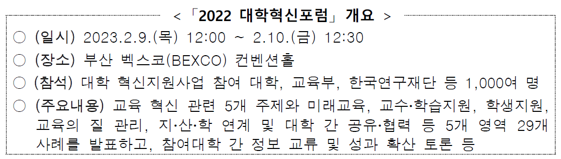 교육부(부총리 겸 교육부장관 이주호)는 한국연구재단(이사장 이광복), 대학혁신지원사업총괄협의회(회장 김석수)와 함께 ‘2022 대학혁신토론회(포럼)’를 2월 9일(목)부터 2월 10일(금)까지 양일간 부산 벡스코에서 개최한다. 이번 토론회(포럼)는 대학 혁신지원사업 참여 대학(153개교)의 2022년 혁신지원사업 운영 성과를 공유‧확산하기 위해 마련되었다.