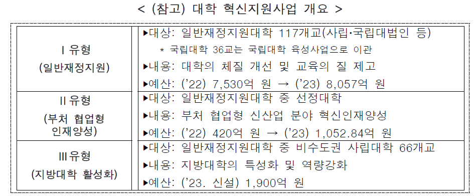 - 2023년 대학혁신지원사업 일반재정지원(Ⅰ유형), 부처 협업형 인재양성(Ⅱ유형), 지방대학 활성화(Ⅲ유형)를 위해 총 1조 1,009억 원 지원 계획