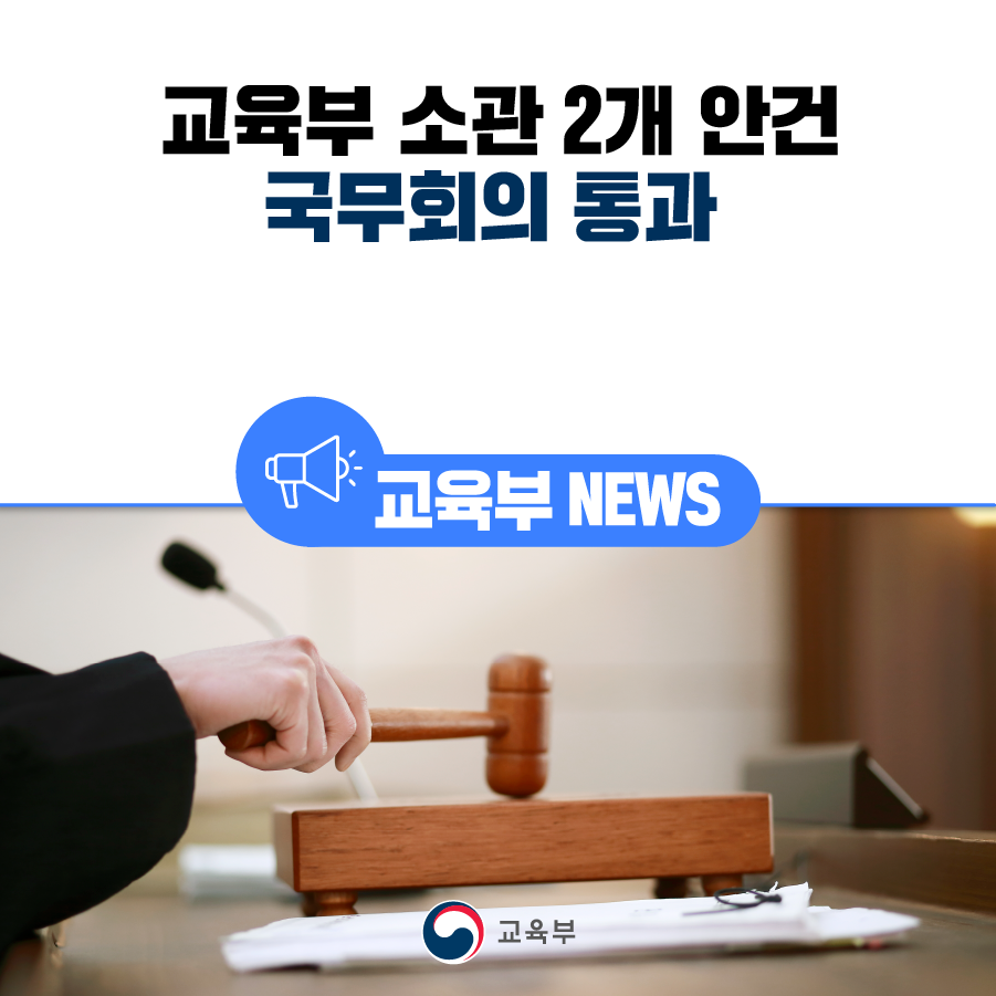교육부(부총리 겸 교육부장관 이주호)는 2월 14일(화) 국무회의에서 「병역의무 이행 관련 교원미임용자 채용에 관한 특별법 시행령 폐지령안」, 「학교용지부담금 환급 등에 관한 특별법 시행령 폐지령안」 등 교육부 소관 2개 안건이 통과되었다고 밝혔다.