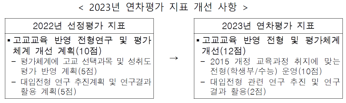 올해 연차평가는 각 대학에서 2015 개정 교육과정 취지에 맞게 전형을 운영할 수 있도록 관련 지표를 일부 조정하고 배점을 추가하였다.