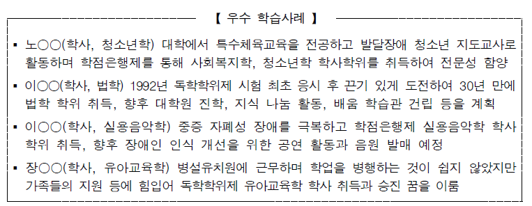 ※ 1990년(독학학위제), 1997년(학점은행제)부터 제도가 시작된 이래 104만 5천여 명(학점 1,022,508명, 독학 23,197명)의 학습자가 학위 취득 - 개개방성과 다양성을 바탕으로 성인 학습자들에게는 새로운 배움과 미래 성장 경로를 제시하며 능동적인 평생학습문화 형성에 기여