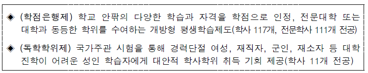 학점은행제 학위취득자 중 전문대학(9,599명) 또는 대학(9,474명)을 기 졸업한 학습자는 총 19,073명(52.1%)으로 성인 학습자가 전문대학 또는 대학 졸업 후 새로운 학위 및 자격 취득, 자기 계발 등을 위해 학점은행제를 활용하고 있음을 알 수 있다. 독학학위제도 학위취득자 중 직장인 비율이 54.7%(280명)로 나타나 능동적인 평생학습문화 형성에 기여하고 있음을 확인할 수 있다.