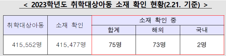 학교와 경찰은 교육(지원)청·지자체와 협력하여 취학대상아동 415,552명 중 99.9%에 해당하는 415,477명의 소재를 최종 확인하였다. 경찰청(청장 윤희근)은 2023년 2월 21일 현재 수사 의뢰된348명중 273명에 대한 소재를 확인하였으며, 75명에 대해서는 수사를 지속할 계획이다.