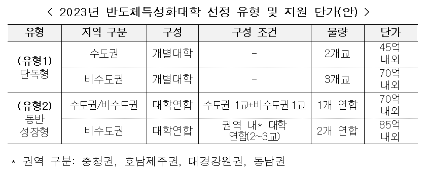 - 2023년부터 반도체 인재양성 역량과 의지를 갖춘 특성화대학 수도권 3곳, 비수도권 5곳을 선정하여 연간 540억 원 집중 투자