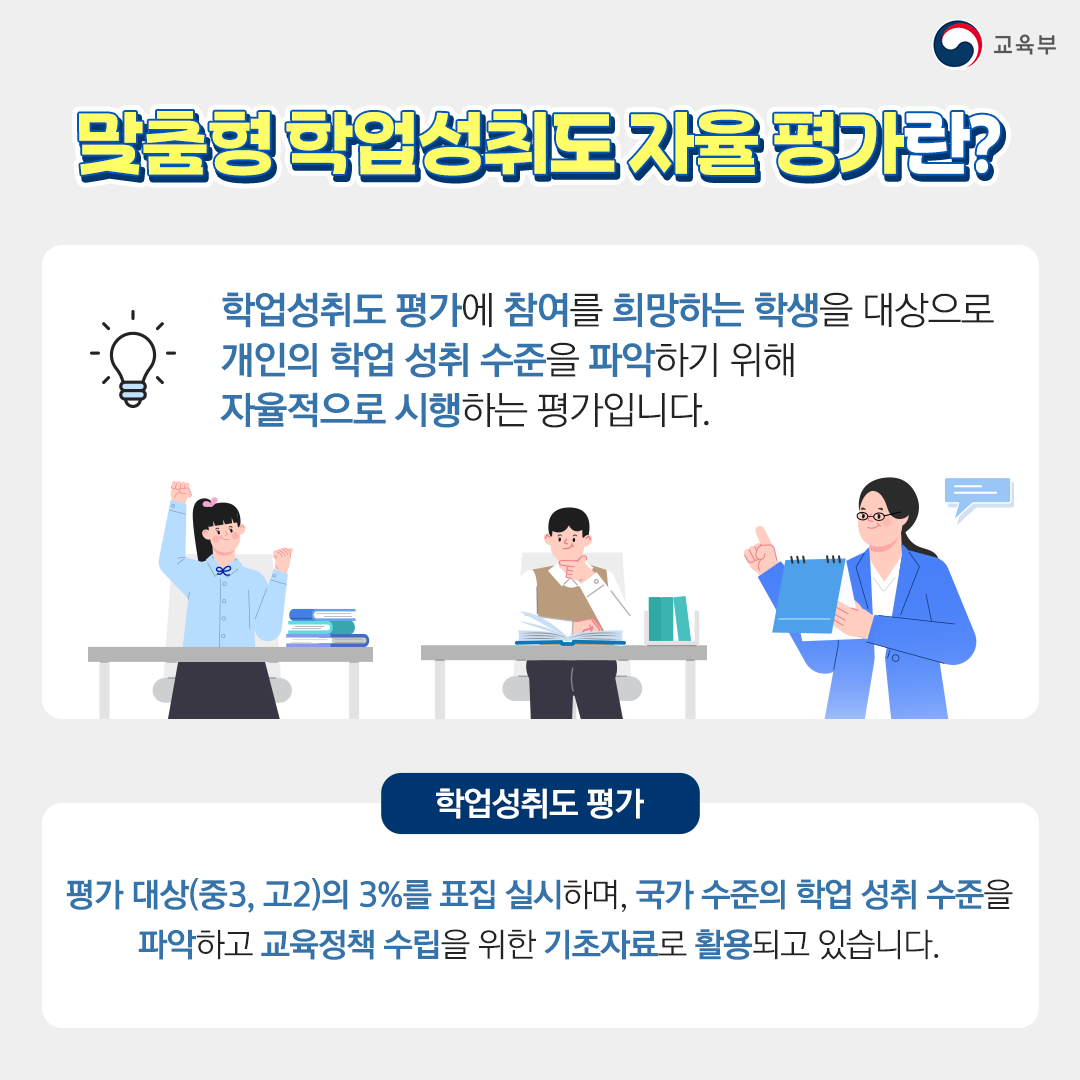 학업성취도 평가에 참여를 희망하는 학생을 대상으로 개인의 학업 성취 수준을 파악하기 위해 자율적으로 시행하는 평가입니다.