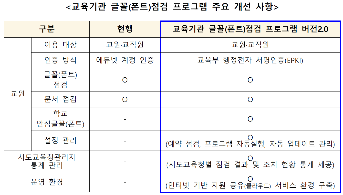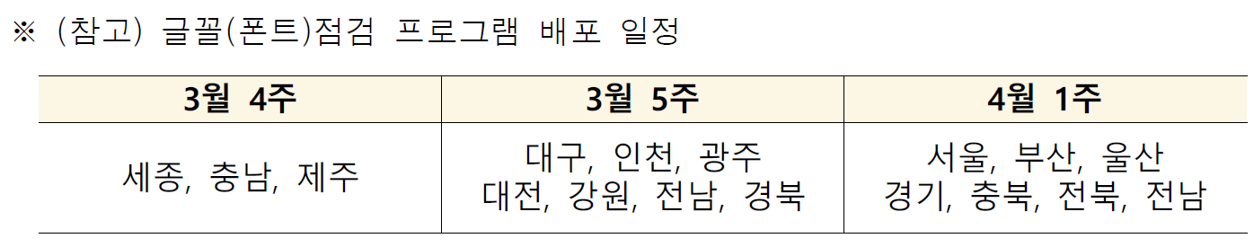 한편 글꼴(폰트) 점검프로그램은 배포 후에 학교에서 사용방법 문의 등이 폭증할 것을 고려하여 원활한 활용 지원을 위해 3월 4주부터 시도교육청별로 순차대로 배포할 계획이다.