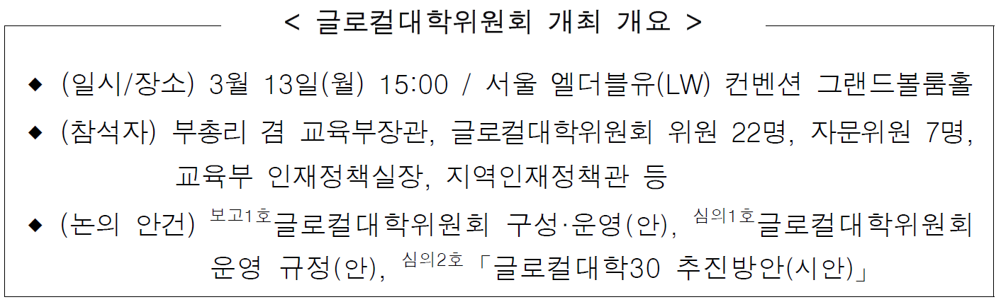 글로컬대학위원회는 3월 13일(월), 서울 엘더블유(LW) 컨벤션에서 제1차 회의를 개최하고, 글로컬대학위원회 운영 규정(안)과 「글로컬대학30 추진방안」(시안)에 대해 심의한다.