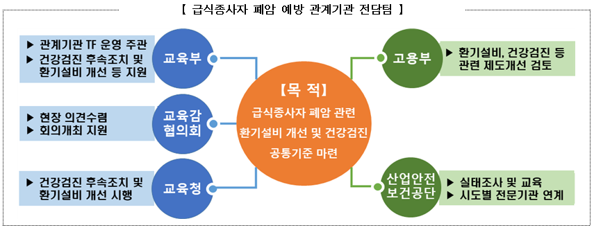 교육부는 조리실 환기설비 개선 방안 등을 논의하기 위해 고용부, 전국시도교육감협의회, 시도교육청, 안전보건공단과 함께 ‘학교 급식종사자 폐암 예방 관계기관 전담팀(TF)(이하 ‘관계기관 전담팀’)’을 운영(2023.2.~)한다.