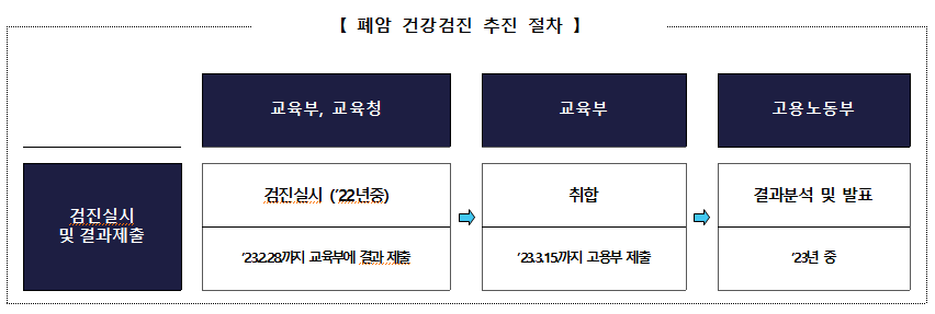 이번 건강검진은 고용노동부의「학교 급식종사자 폐암 검진계획」(2021.12.)에 따라 학교 급식종사자 중 55세 이상 또는 경력 10년 이상 근무자를 대상으로 실시하였으며 교육부는 검진 결과를 고용부로 송부(3.15.)할 예정이다.