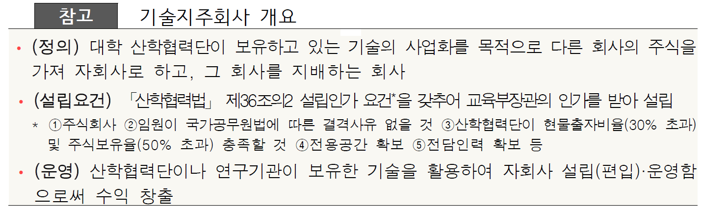 기술지주회사는 대학이 보유한 기술을 사업화하고 이를 통해 창출된 수익을 연구에 재투자하는 선순환 체계를 구축하고자 2007년 산학협력법 개정을 통해 도입되었다.