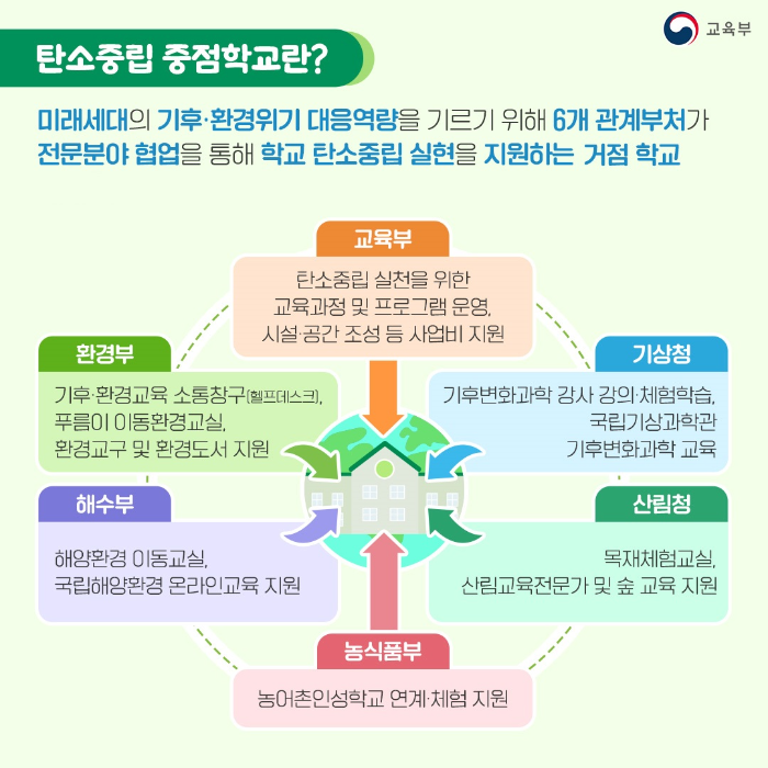 미래세대의 기후·환경위기 대응역량을 기르기 위해 6개 관계부처가 전문분야 협업을 통해 학교 탄소중립 실현을 지원하는 거점 학교