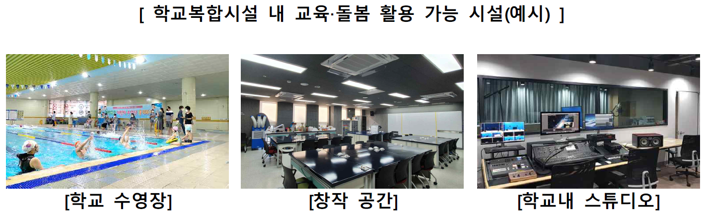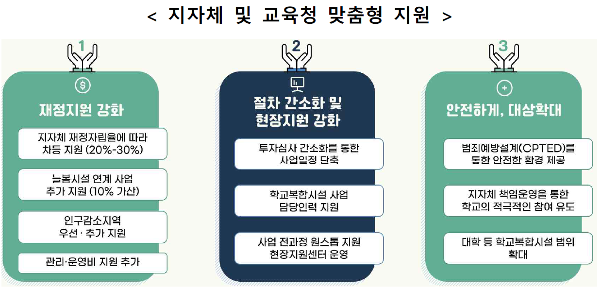 | 229개 모든 기초지자체 단위에서 학교복합시설이 운영되도록 설치, 늘봄학교 방과후 프로그램 운영학교 우선 지원 |