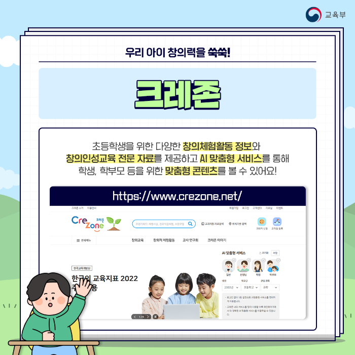 크레존은 대한민국의 다양한 창의체험 정보와 창의인성교육 전문자료를 모두 접할 수 있는 온라인 플랫폼입니다.