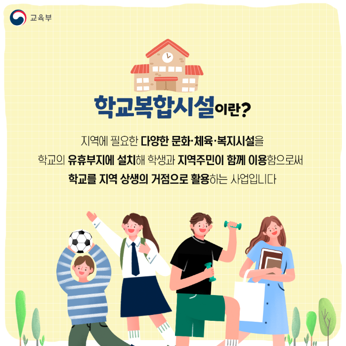 지역에 필요한 다양한 문화·체육·복지시설을 학교의 유휴부지에 설치해 학생과 지역주민이 함께 이용함으로써 학교를 지역 상생의 거점으로 활용하는 사업입니다.