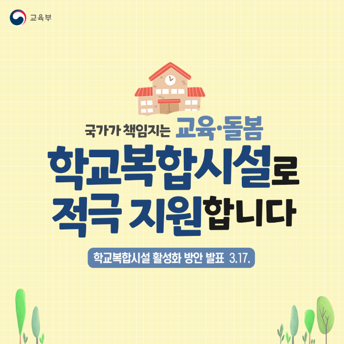 대한민국 교육부 2023. 3. 17. 19:00국가가 책임지는 교육·돌봄 학교복합시설로 적극 지원합니다