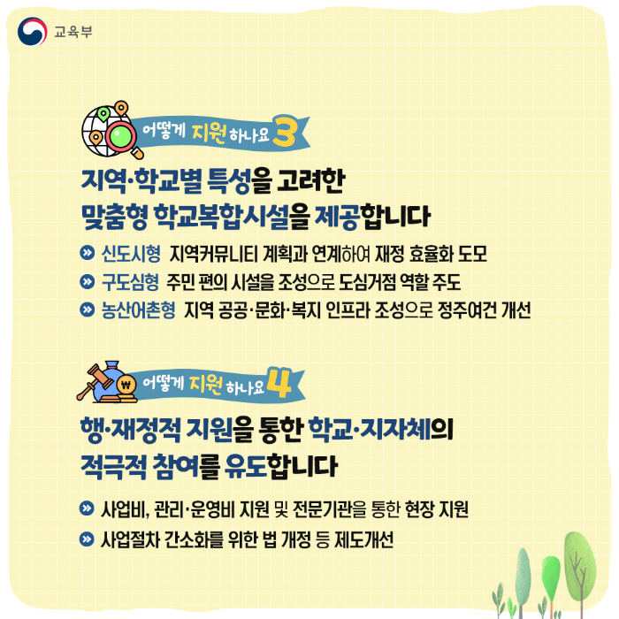 모든 기초지자체 단위에서 학교복합시설이 운영될 수 있도록 설치를 지원합니다