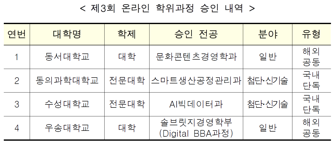 교육부(부총리 겸 교육부장관 이주호)는 3월 24(금), ‘일반대학의 온라인 학위과정’ 심사 결과 4개 대학의 4개 (전문)학사과정이 승인되었다고 발표하였다.