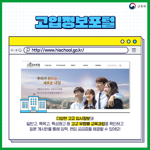 교육과학부 운영, 고등학교입시 정보 서비스, 학교 유형별 전형방법, 전형일정, 체험 후기 등 제공.