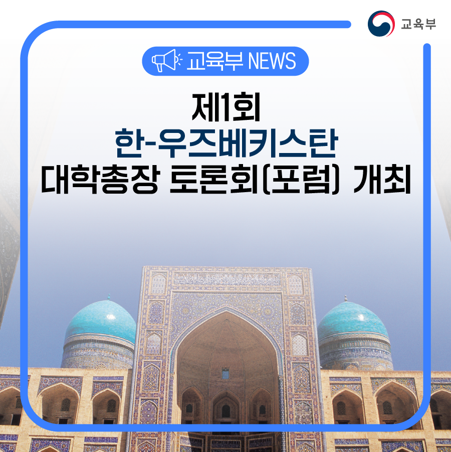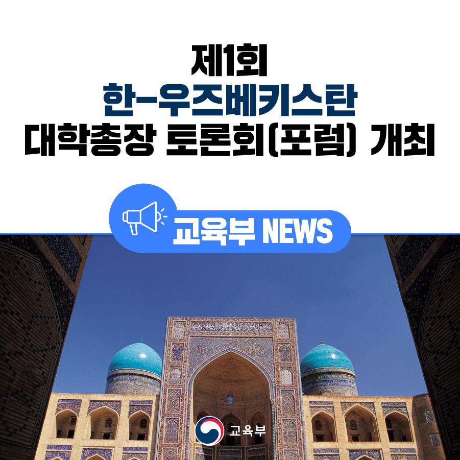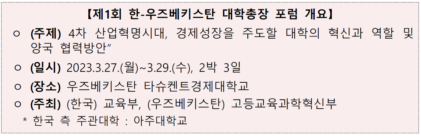 교육부(부총리 겸 교육부장관 이주호)는 아주대학교(총장 최기주)*와 함께 ‘4차 산업혁명시대, 경제성장을 주도할 대학의 혁신과 역할 및 양국 협력방안’을 주제로「제1회 한-우즈베키스탄 대학총장 토론회(포럼)」를 3월 27일(월), 우즈베키스탄 타슈켄트경제대학교에서 개최한다.