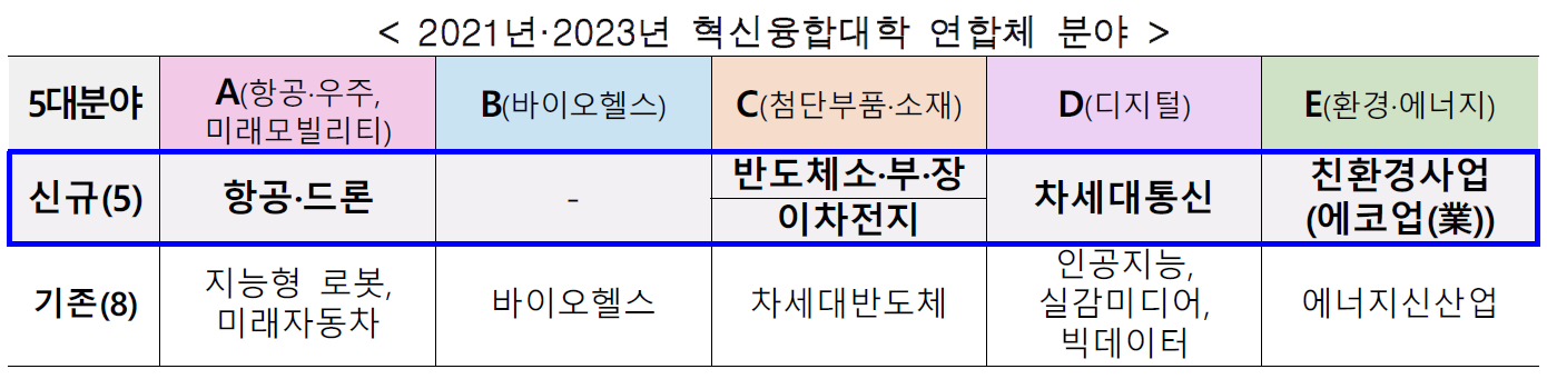 5개 신규 분야는 범부처 협업 「첨단분야 인재양성 전략(2023.2)」의 ‘5대 핵심 분야’ 및 관련 부처별 정책 등을 고려하여 ①항공·드론, ②반도체 소·부·장, ③이차전지, ④차세대통신, ⑤친환경사업(에코업(業))으로 지정하였으며, 기존 8개 분야는 총 6년, 신규 5개 분야는 총 4년 동안 지원하여 13개 연합체가 2026년까지 운영된다.