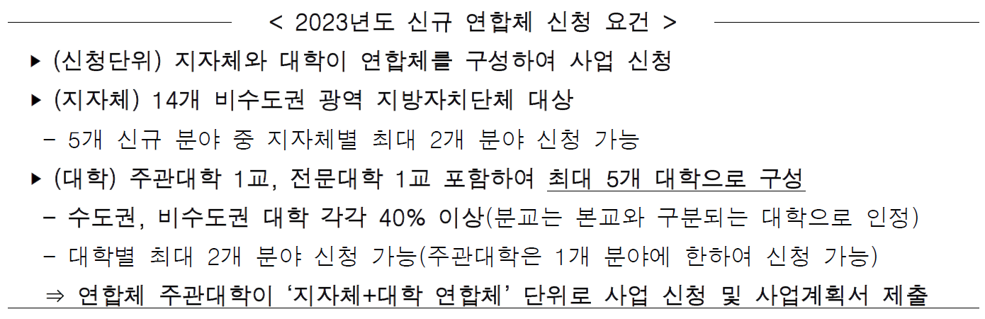 올해 ‘지자체 참여형’ 신규 5개 연합체는 △신규 선정 분야 관련 산업 기반 및 전략 등을 보유한 비수도권 광역지자체와 △해당 분야 교육 역량을 갖춘 대학들이(최대 5개교, 수도권/비수도권 각 40% 이상) 함께 연합체를 구성하여 사업을 신청할 수 있다.