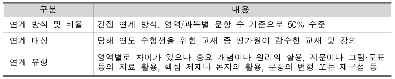 EBS 수능 교재 및 강의와 수능 출제의 연계는 간접 방식으로 이루어지고, 연계 교재에 포함된 도표, 그림, 지문 등 자료 활용을 통해 연계 체감도를 높일 예정이다. 연계율은 영역/과목별 문항 수 기준으로 50% 수준을 유지한다.