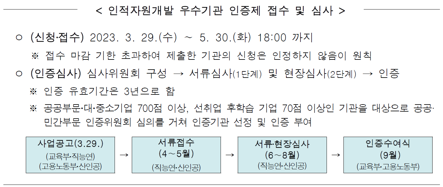 교육부(부총리 겸 교육부 장관 이주호)와 고용노동부(장관 이정식)는 ‘2023년도 인적자원개발 우수기관 인증(Best HRD) 사업’을 3월 29일(수)에 공고하였다.