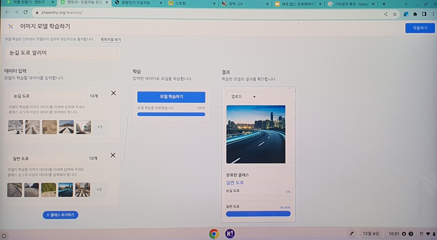 네 맞습니다. 저희는 이 크롬북에서 엔트리라는 소프트웨어 창작 플랫폼을 사용하여 눈길 사진과 일반 도로 사진을 보여주고 두 사진을 분류해낼 수 있는 AI 분류모델을 생성해 냈습니다. 즉, AI에 다양한 눈길 사진과 일반 도로 사진을 학습시킨 것이죠. 그리고 위의 AI 분류모델을 코딩 프로그램 마이크로비트에 연결했습니다. 스크래치라는 블록 코딩 툴을 사용하여 명령어 블록을 이어 붙이는 방식으로 안전 운전을 안내 프로그램을 만들었습니다.