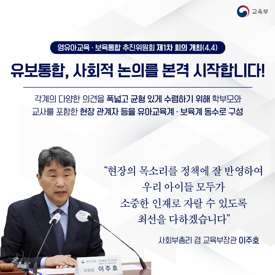 유보통합, 사회적 논의를 본격 시작합니다! - 영유아교육·보육통합 추진위원회 제1차 회의 개최(4.4)