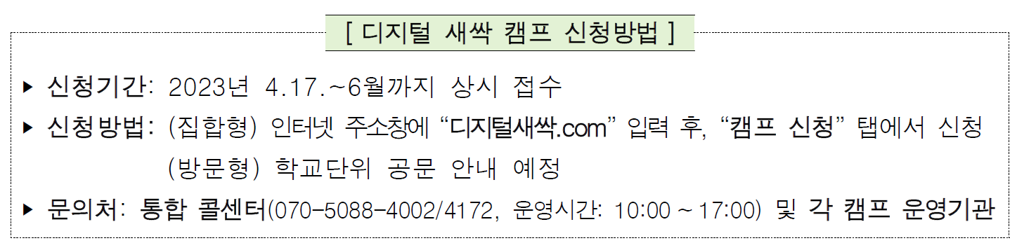 이를 위해 교육부는 2023년 상반기 「디지털 새싹 캠프」 운영기관 선정 심사를 진행하였으며 권역형(주중·주말 방과후 캠프) 30개 기관과 기획형(교과연계형 기획캠프) 1개 기관, 총 31개 주관기관을 선정하였다.