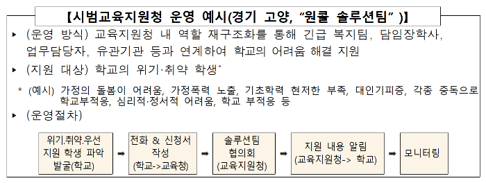 시범교육지원청들은 학교가 경제적 곤란, 기초학력 부진, 심리정서 위기, 아동학대, 학교폭력 등 복합적 어려움을 가진 고위기학생의 지원을 의뢰할 경우 내외부 협력 체계를 통해 학생에게 맞춤형 지원을 한다. 또한 학교가 조기 발굴-예방 중심의 학생 지원 역량을 갖출 수 있도록 지원한다.