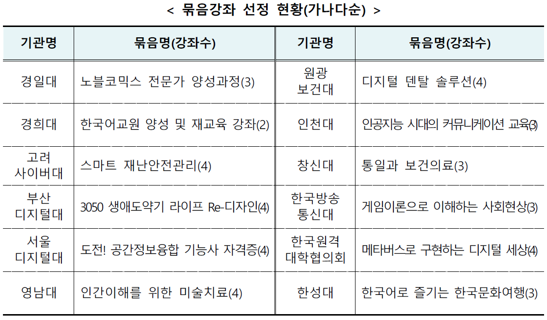 ‘3050 생애도약기 라이프 Re-디자인’(부산디지털대), ‘노블코믹스전문가 양성과정’(경일대) 등 성인들의 재교육·향상교육과 웹툰 등 사회 변화에 따른 학습자의 요구를 반영한 신규 강좌가 개설되어 학습자들의 많은 관심과 참여가 기대된다.