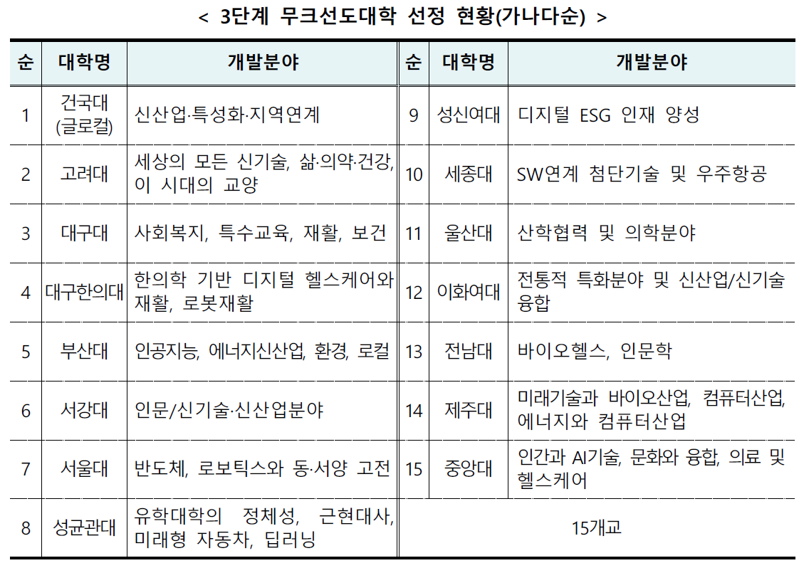 무크선도대학에는 강점·특화 분야 및 신기술·신산업 수요 분야의 개발역량 등이 풍부한 15개교가 최종 선정되었다.