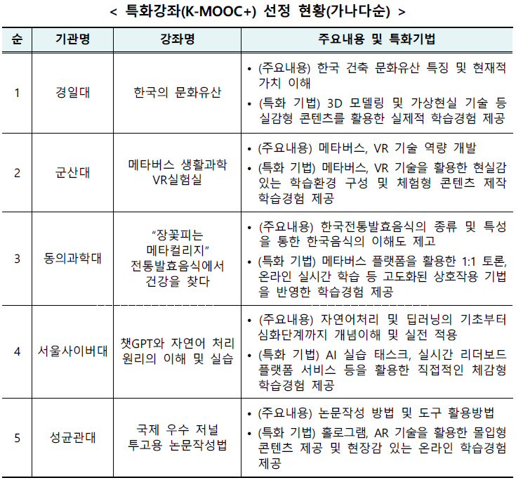 최신 기술을 활용한 실감형 콘텐츠 및 고도화된 상호작용 기법 등을 반영한 특화강좌(K-MOOC+)는 5개 강좌를 선정하였다.
