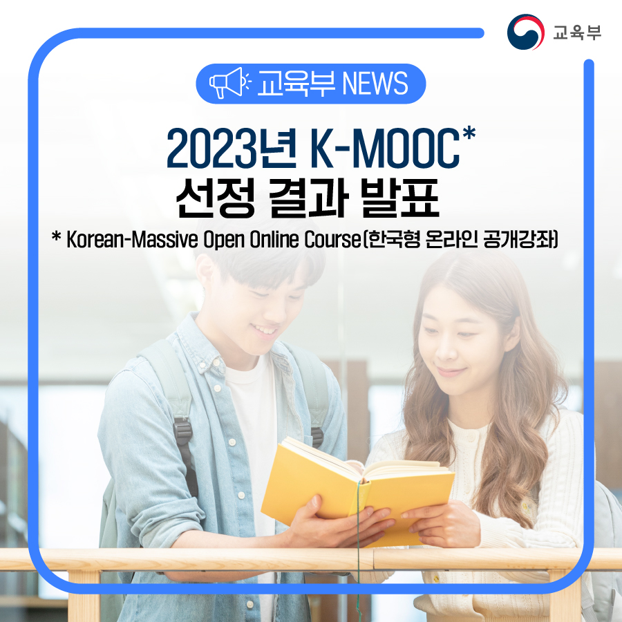 교육부(부총리 겸 교육부장관 이주호)와 국가평생교육진흥원(원장 강대중)은 ‘2023년 한국형 온라인 공개강좌(이하 ‘케이무크(K-MOOC)’) 선정 결과’를 발표한다.
